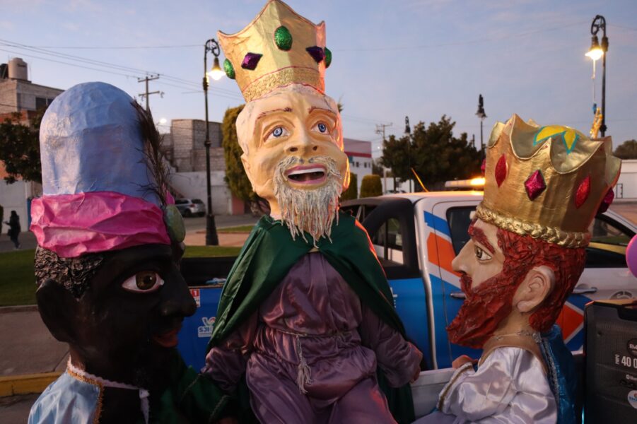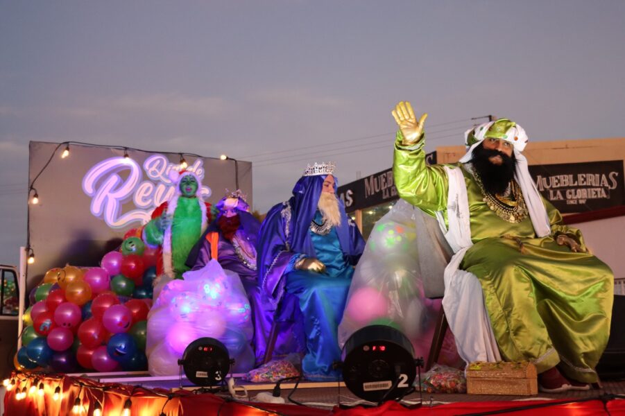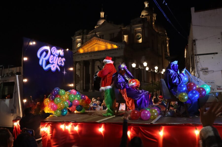 Más tarde comenzó el desfile de Día de Reyes con carros alegóricos, adornados con motivos de las fechas decembrinas, partiendo de la Glorieta del Mapa con destino al Jardín Principal, en donde repartieron dulces y pelotas para los más pequeños. A la llegada al centro de la ciudad, los Reyes Magos participaron en una sesión de fotografías del recuerdo con quienes se acercaron.