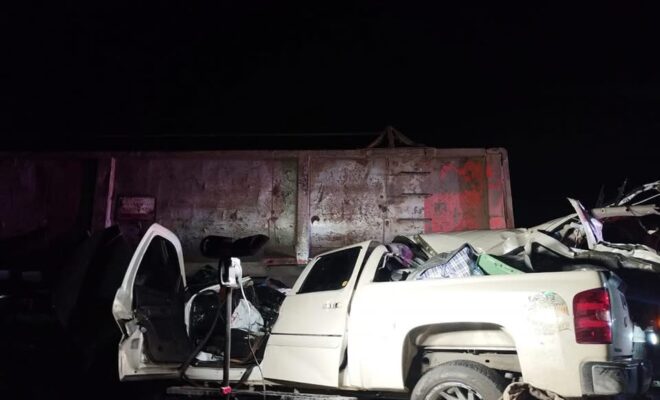 La escena era aparatosa, la camioneta de carga en color blanco estaba destrozada en la parte frontal y de la cabina, compactada contra la caja de un tracto camión.